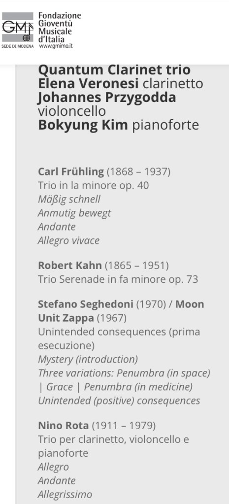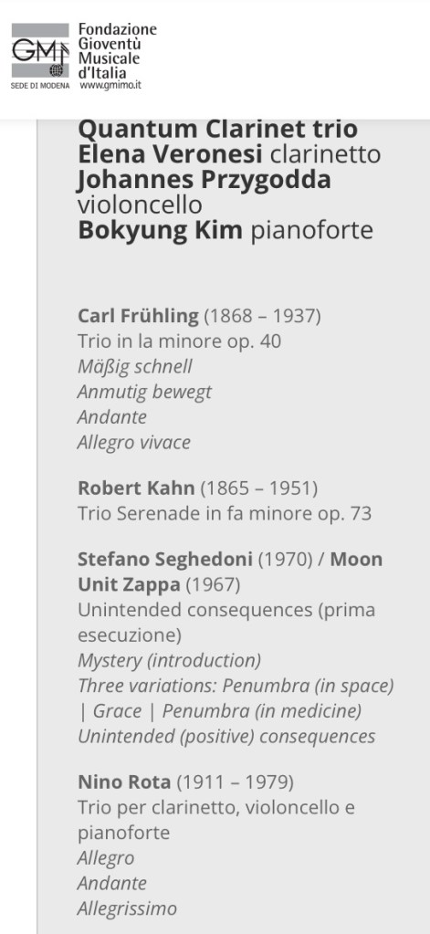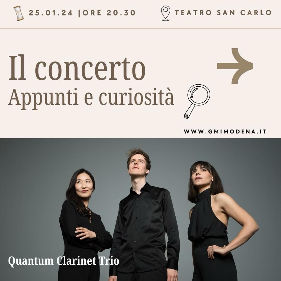Modena, 25th january 2024 Teatro della Fondazione San Carlo. World premiere of “Unintended consequences” (for clarinet, cello and piano). Quantum clarinet trio.